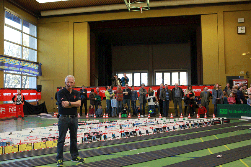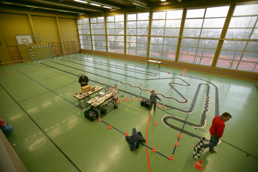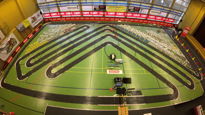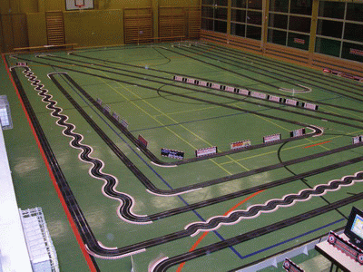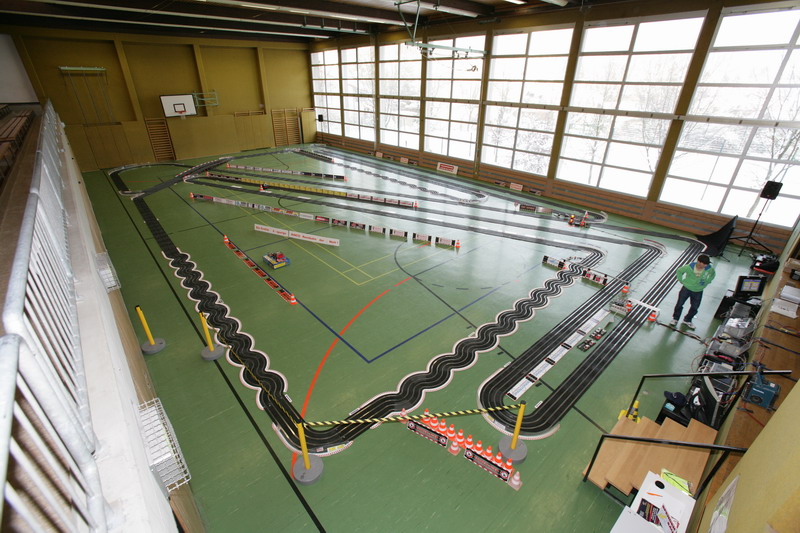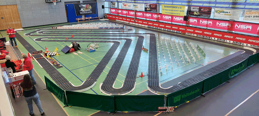 150 Meter lange, 2-spurige NINCO Rennbahn in der Wasenhalle in Ittersbach