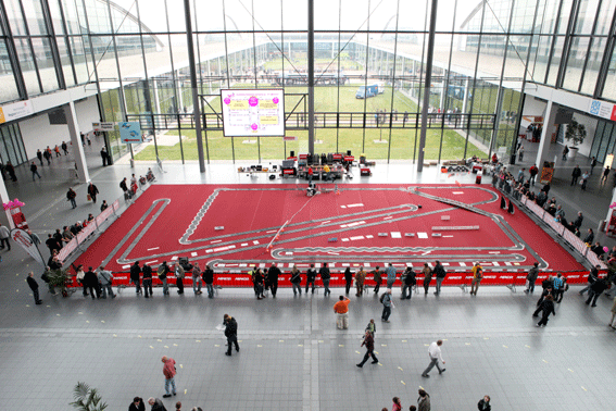 Die 230 Meter lange, 4-spurige Ninco Autorennbahn wurde direkt im Foyer der Messe aufgebaut und war der Magnet für große und kleine Rennfahrer.