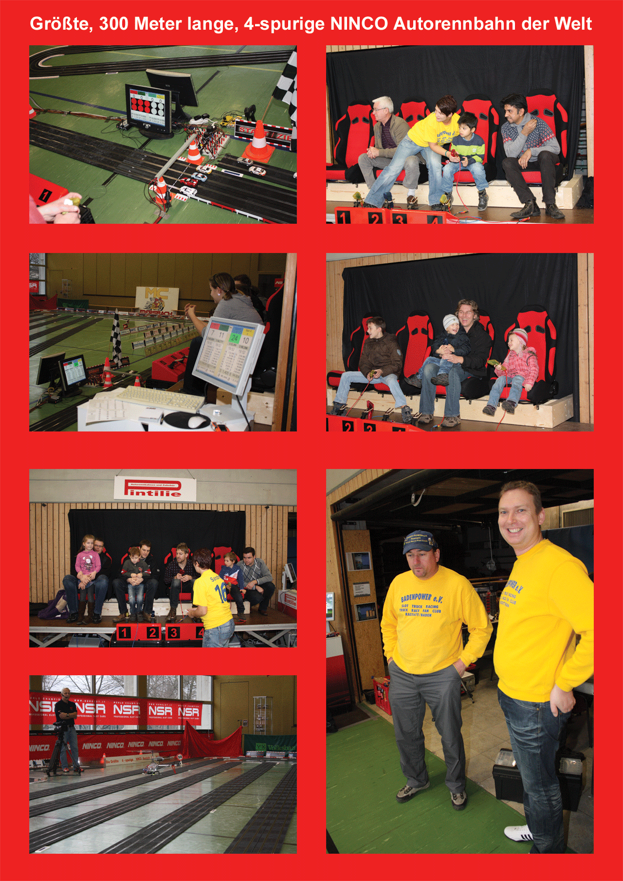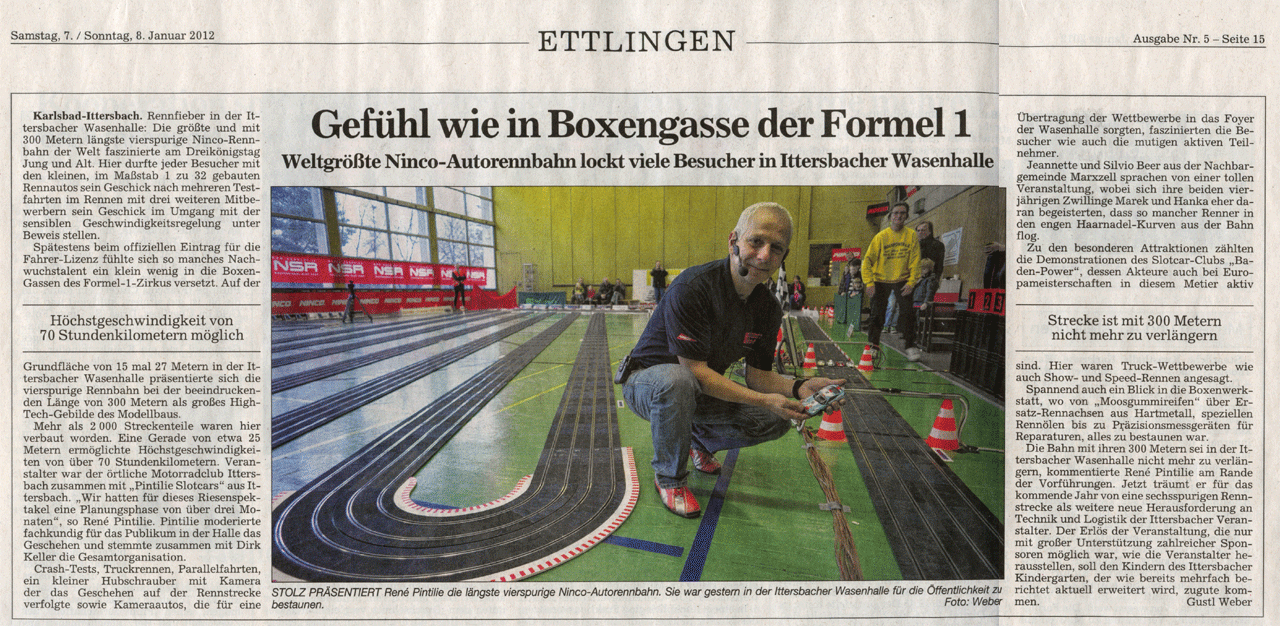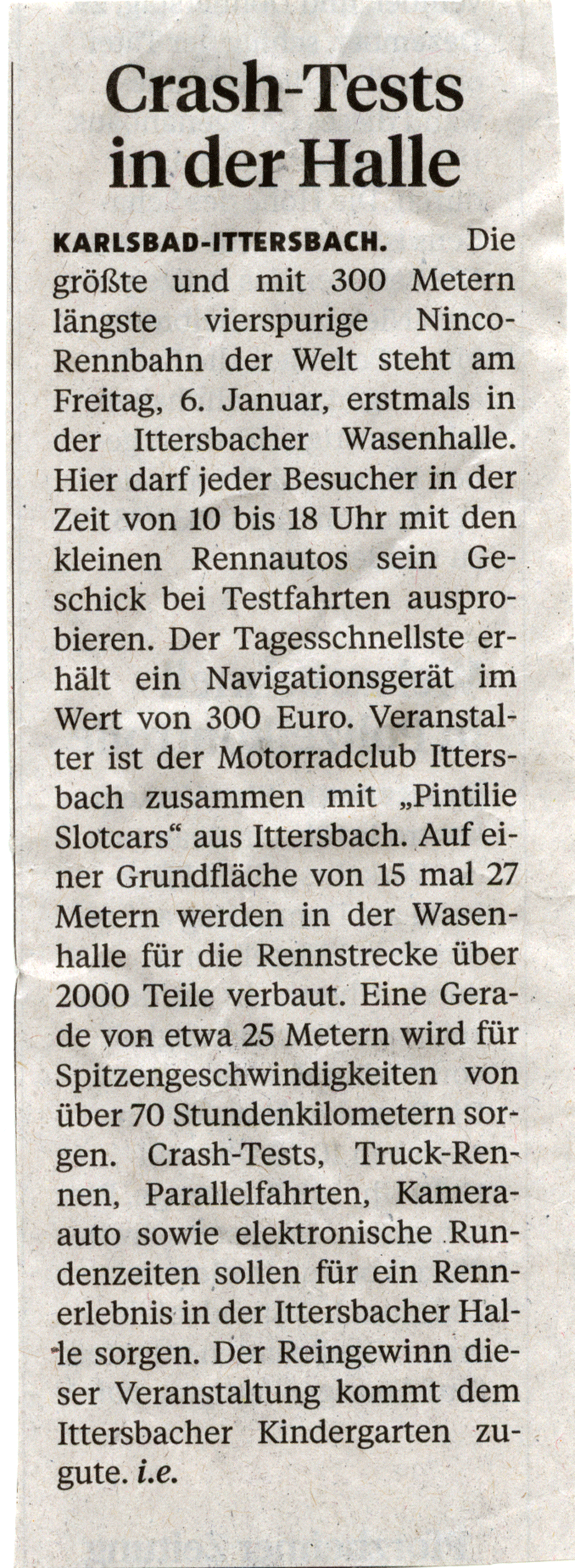 Zwischen Weihnachten und Neujahr wurde in der Wasenhalle in Ittersbach eine 317 Meter lange NINCO Rennbahn aufgebaut auf der jeder kostenlos fahren konnte. Auf der Top Speed Geraden von über 26 Metern wurde eine Geschwindigkeit von 72km/h erreicht.