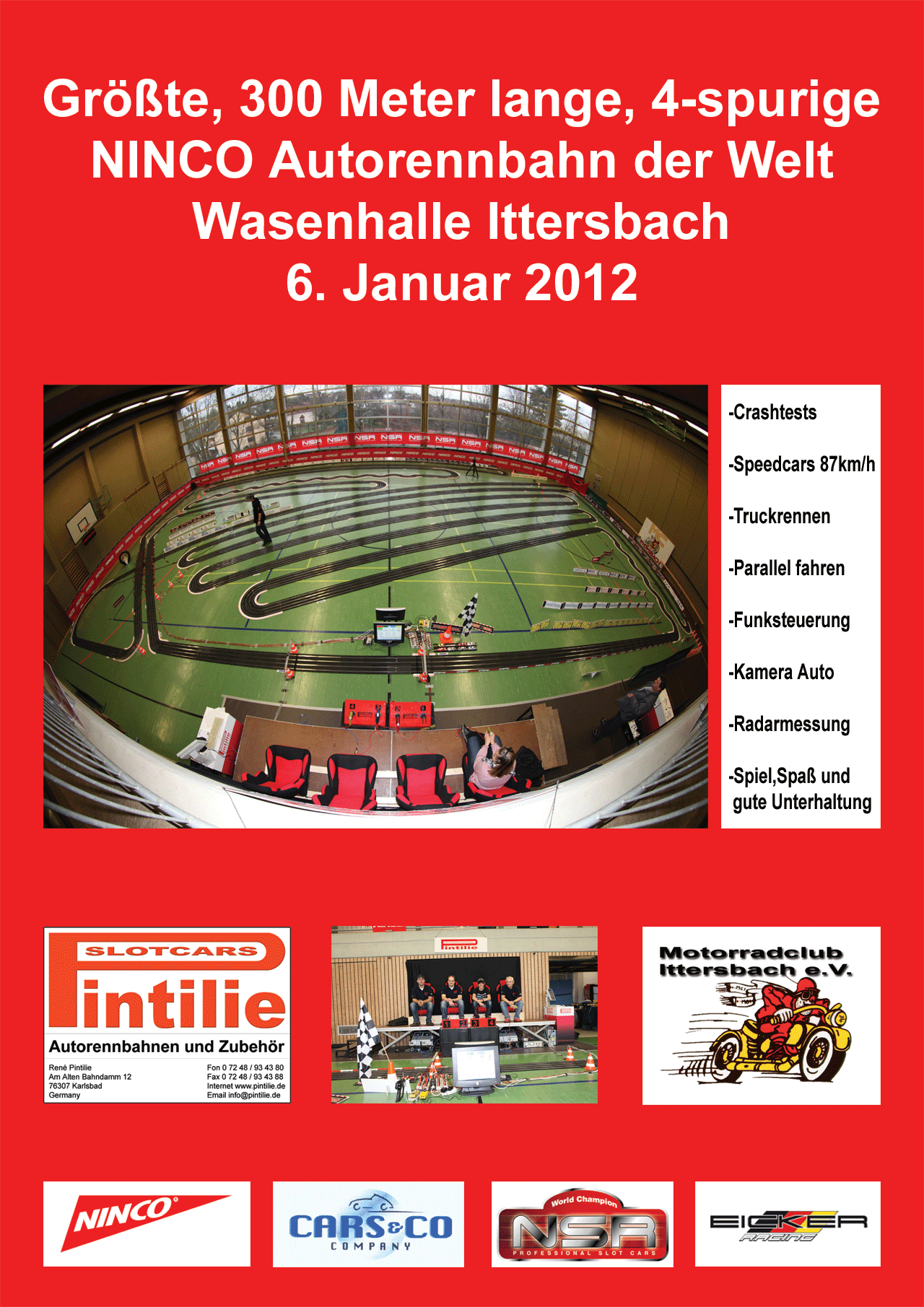 Pintilie Slotcars und der Motorradclub Ittersbach e.V. haben am 30. Dez. 2012 in der Wasenhalle in Ittersbach zum kostenlosen Testfahren auf einer 300 Meter langen, 4-spurigen NINCO Rennbahn eingeladen. Jeder durfte auf der Weltrekordbahn kostenlos fahren.