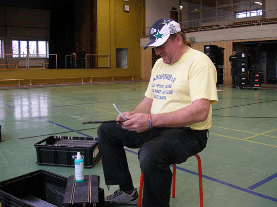 Die Bahn ist aufgebaut und die ersten Flitzer sind schon gefahren. Randstreifen und Banden fehlen noch. Es ist noch viel zu tun. Die Audioanlage fehlt noch, Monitorkabel müssen noch verlegt und angeschlossen werden. Bis jetzt läuft noch kein Rückblick im Foyer und der Ranlistenmonitor ist auch noch nicht angeschlossen.