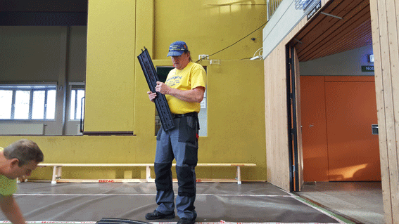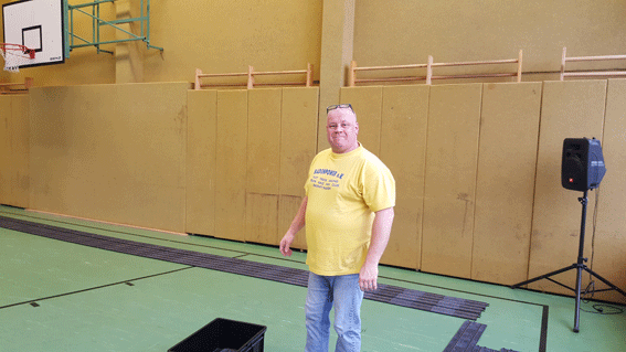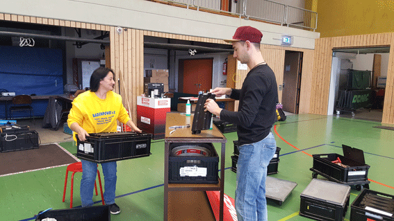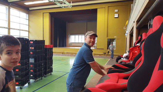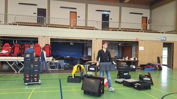 Pünktlich um 10:00 Uhr wurde mit dem Aufbau angefangen. Lars muss Kisten schleppen.