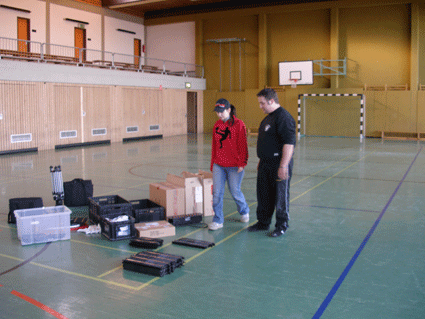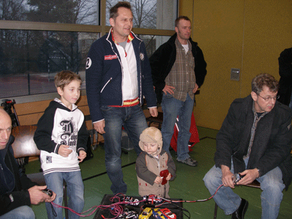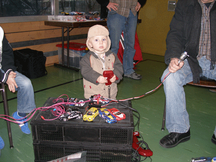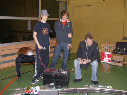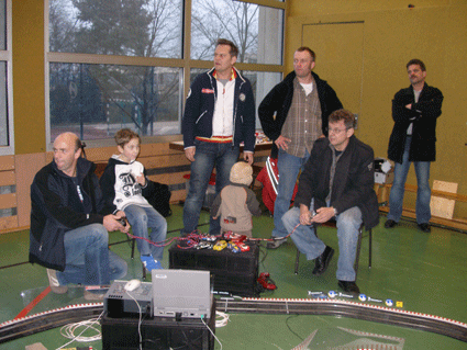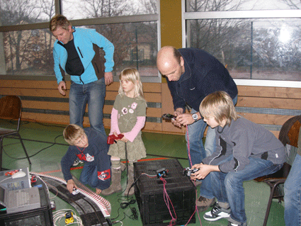 Kontrollzentrum der 70 Meter Ninco Rennbahn in der Wasenhalle in Ittersbach. Gemessen wurde mit zwei RACECONTROL Systemen. Rundenzeiten und Topspeed. Platzbedarf 21,5x8,0 Meter.