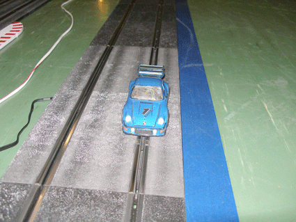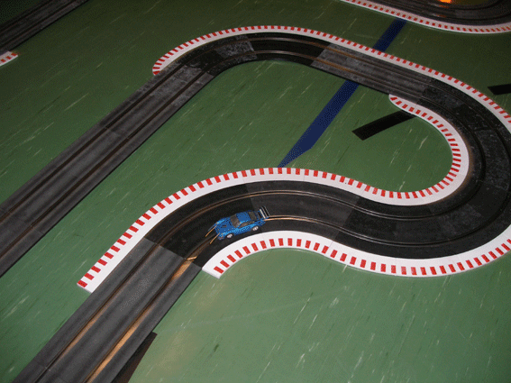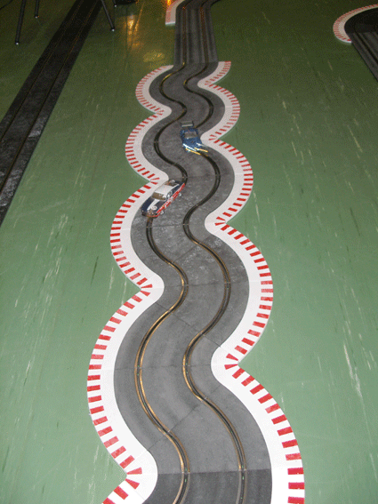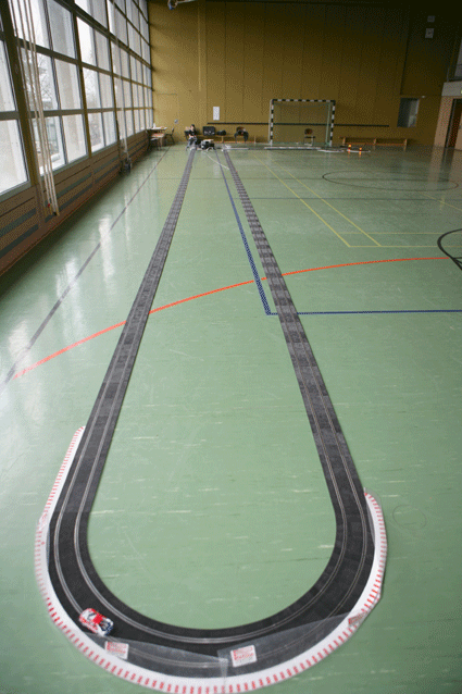 Start und Ziel sowie Kurvenberich der 70 Meter Ninco Rennbahn in der Wasenhalle in Ittersbach
